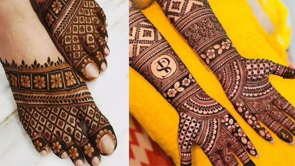 दोनों के लिए अलग-अलग डिजाइन 2025 में ट्रेंड कर रहे हैं, जैसे पैर में फूलों की बड़ी बेल और हाथ में मिनिमल पैटर्न।