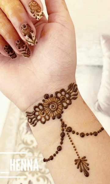 Simple Bracelet Mehndi Design इसमें ब्रेसलेट जैसा पैटर्न कलाई पर डिज़ाइन किया जाता है, जो साधारण और आकर्षक होता है। यह डिज़ाइन किसी भी साधारण या हल्के समारोह में पहनने के लिए परफेक्ट है।